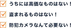 不法侵入などの犯罪者は事前に対象宅を入念にチェックすると言われているため、標的から外れるよう、防犯カメラを設置させていただきました。 -