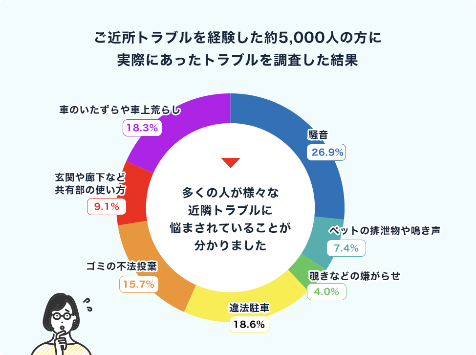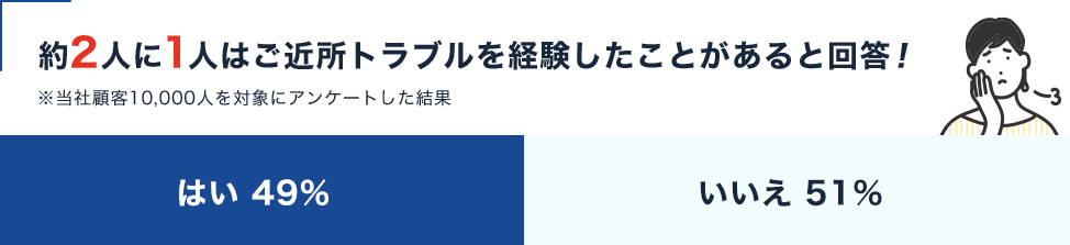 「近隣トラブルを経験したことがある」と回答した人が49%にのぼり、実に半数近くの人が近隣トラブルを経験していることがわかりました。